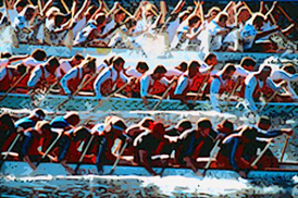 • When paddling, as your bottom arm moves through the air (arm closest to water), the motion is similar to trying to reach for the shoulder of the person in front of you with your bottom arm. Just remember, don’t actually hit the shoulder of the person in front of you!