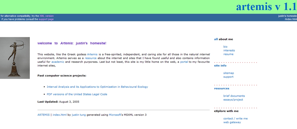 Pioneer in XML and HTML standards based website development. Personal website now archived at Cornell University and a modern copy on GitHub with source code. Content ranging from bookmark sharing, resume, to academic content.